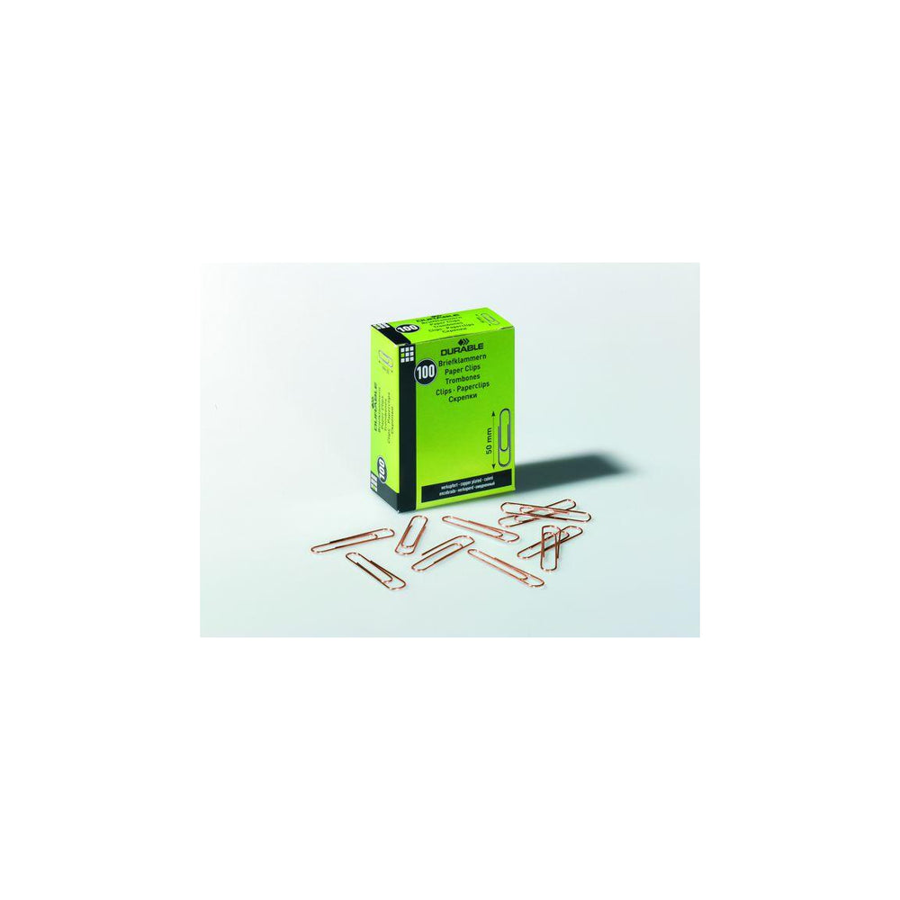 Bundle documents without staples with these copper-coated paper clips from Durable. Stock up on these copper-coated paper clips from Durable - an easy way to bundle documents without permanent staples. This pack of paper clips is perfect to keep on hand in the office, at home and at school. The classic design provides a reliable grip and keeps papers together neatly and tidily. These large 50mm copper-coated paper clips from Durable are a smart way to keep reports, bills or schoolwork in order. - Keep paperwork organised without staples - Classic metal paper clips - Ideal for home, office and school - Colour: Copper coating, nickel-free - Dimensions: 50mm - Quantity: 100