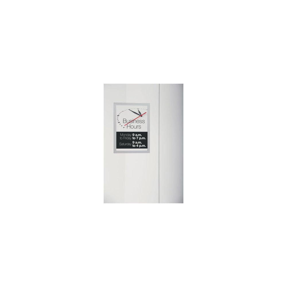 UV-resistant DURAFRAME® Sun is a self-adhesive, magnetic sign frame that is perfect for displaying notices, signs, messages, posters and more on glass surfaces that are exposed to light. The DURAFRAME® Sun magnetic info frame is an easy and effective way to display signs, posters and all other types of messages. Simply peel off the protective paper and place the self-adhesive backing on a smooth and firm surface, like a window, so that the information can be read from both sides. The magnetic seal ensures that the content stays in place. The foldable magnetic front also allows you to easily remove and change the content. When you put the posters on glass surfaces and windows, they can be moved without leaving a trace. The frame is readable from two sides and you can display different messages on both sides. Made of PVC - UV-resistant sign frame - Heat resistant up to 70°C - A professional and easy way to display messages - Attach the self-adhesive backing to any smooth, solid surface - Removable on glass/windows - No messy residue on surfaces - For A4-sized paper - Use in portrait or landscape format - Frame size: 236 x 323 mm - Colour: Silver