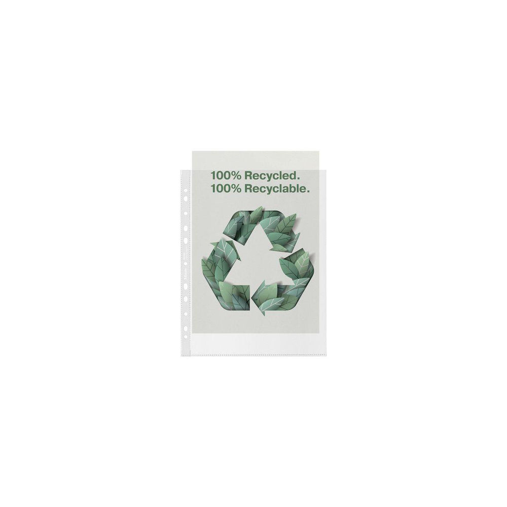 A4 MAXI plastic pocket for daily use in extra strong 100% recycled PP that holds up to 80 sheets! Multi-punched strip allows easy storage of documents in binders. Holds more A4 paper sheets than regular pockets, up to 80. The whole product can be reused and recycled. It is packed in a cardboard box that is also 100% recycled and recyclable. Made in Europe, recycled content confirmed by UL. Embossed - A4 Maxi format - Holds up to 80 sheets - Thickness: 0.10 - 100 pieces per pack - 100% recycled and recyclable