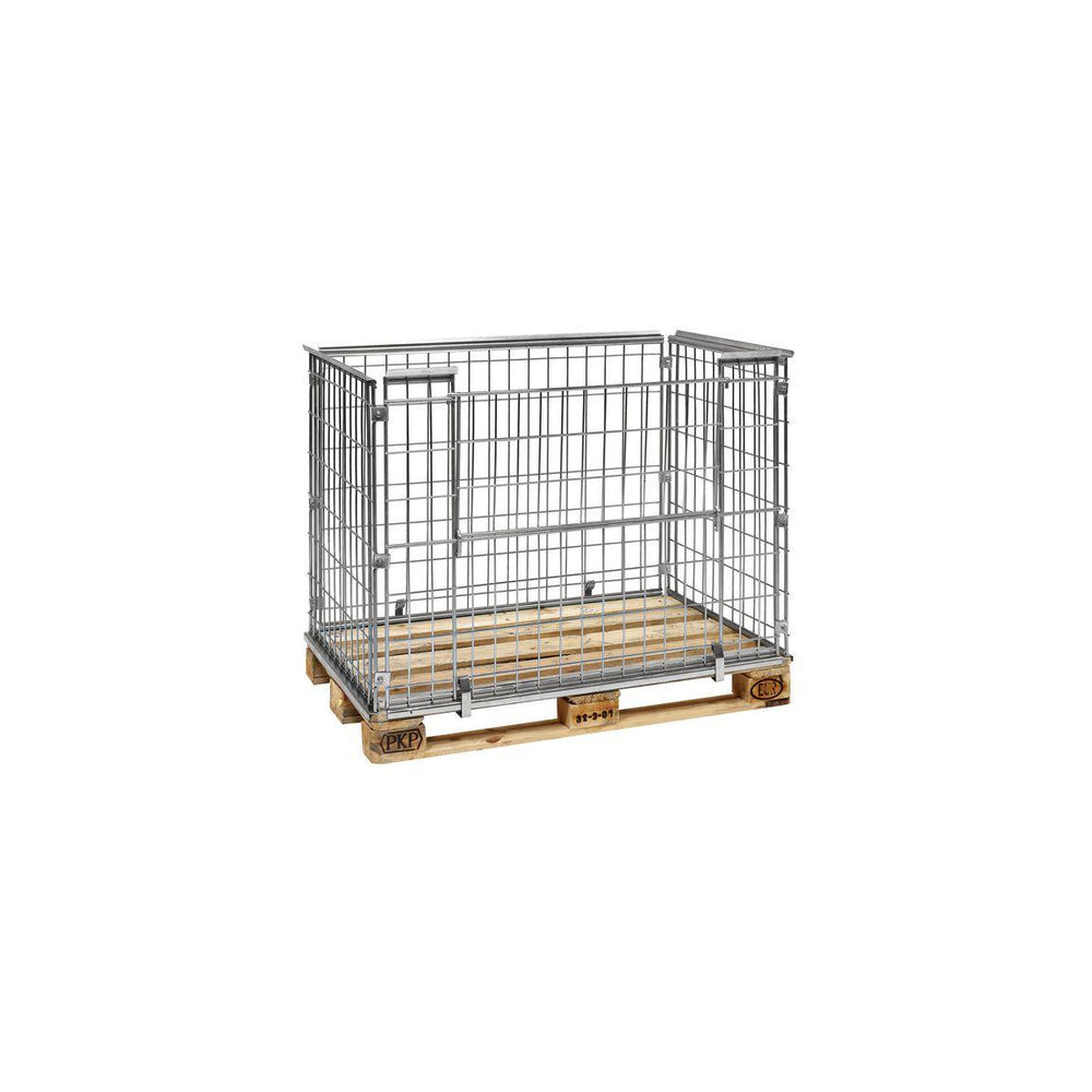 Pallet frame adapted for EUR pallets that can be folded and stacked when not in use. Galvanised and with opening on the long side - Stackable with load up to 800kg - Size: 1220 x 820 x 870mm (LxWxH) - Internal dimensions: 1150 x 740 x 850mm - Mesh size: 65 x 120mm - For EUR pallets 1200 x 800mm - Trolley weight: 27kg