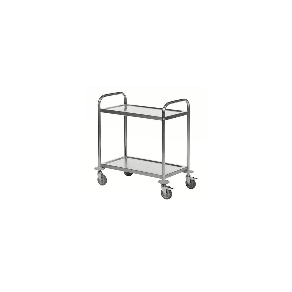 Simple two-level stainless steel trolley suitable for most areas With smooth shelves for easy wiping. With four castors, two of which are braked. Supplied unassembled - Load: 100kg (50kg/shelf) - Size: 710 x 400 x 805mm (LxWxH) - Shelf size: 685 x 380mm - Height to top shelf: 680mm - Distance between shelves: 460mm - Wheel type: 4 castors, 100mm - Braked wheels: Yes - Trolley weight: 9.5kg
