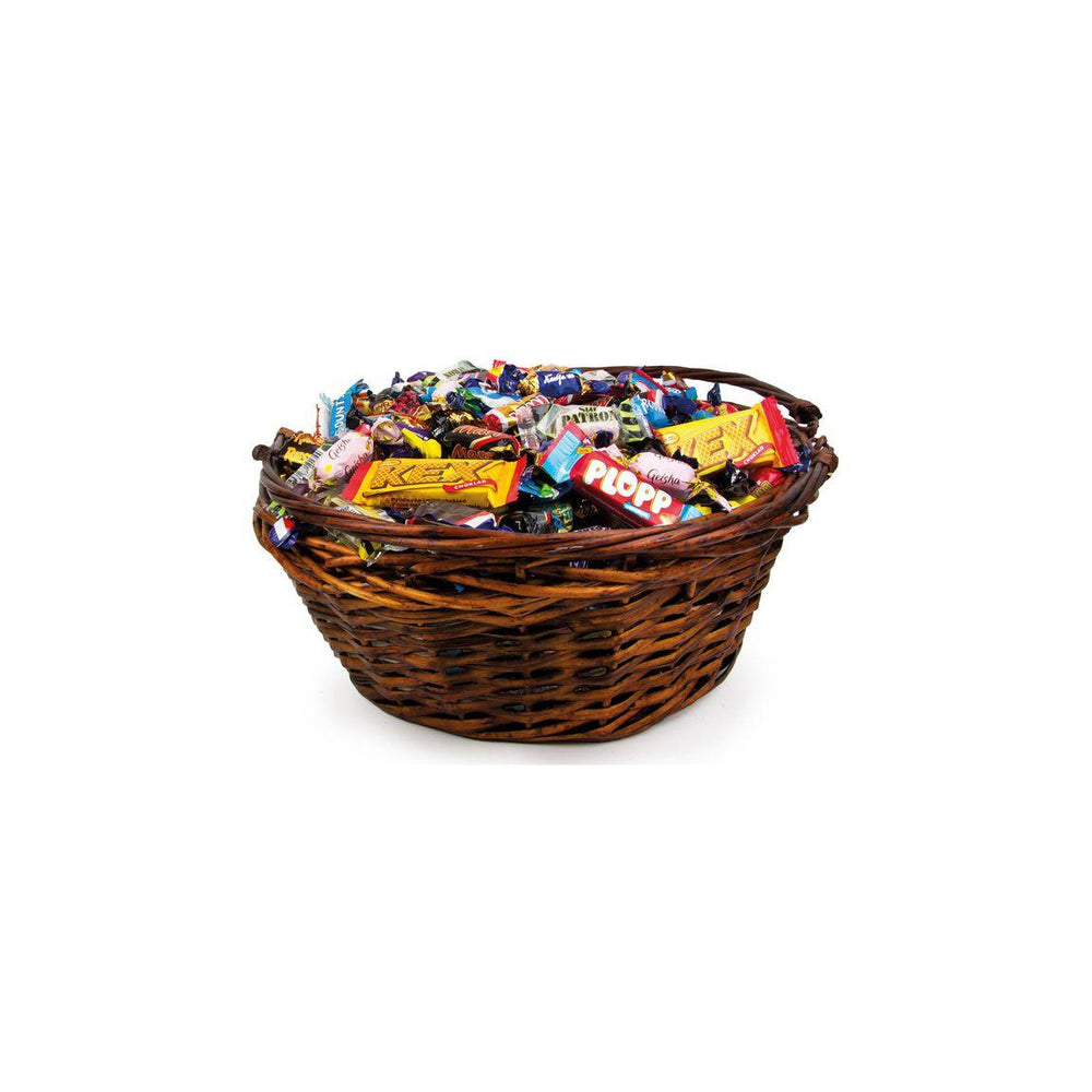 Candy Basket filled with a mix of toffee & chocolate from famous brands. Discover a delicious mix of well-known favourites packed in a brown basket with handle, golden bow, and cellophane.