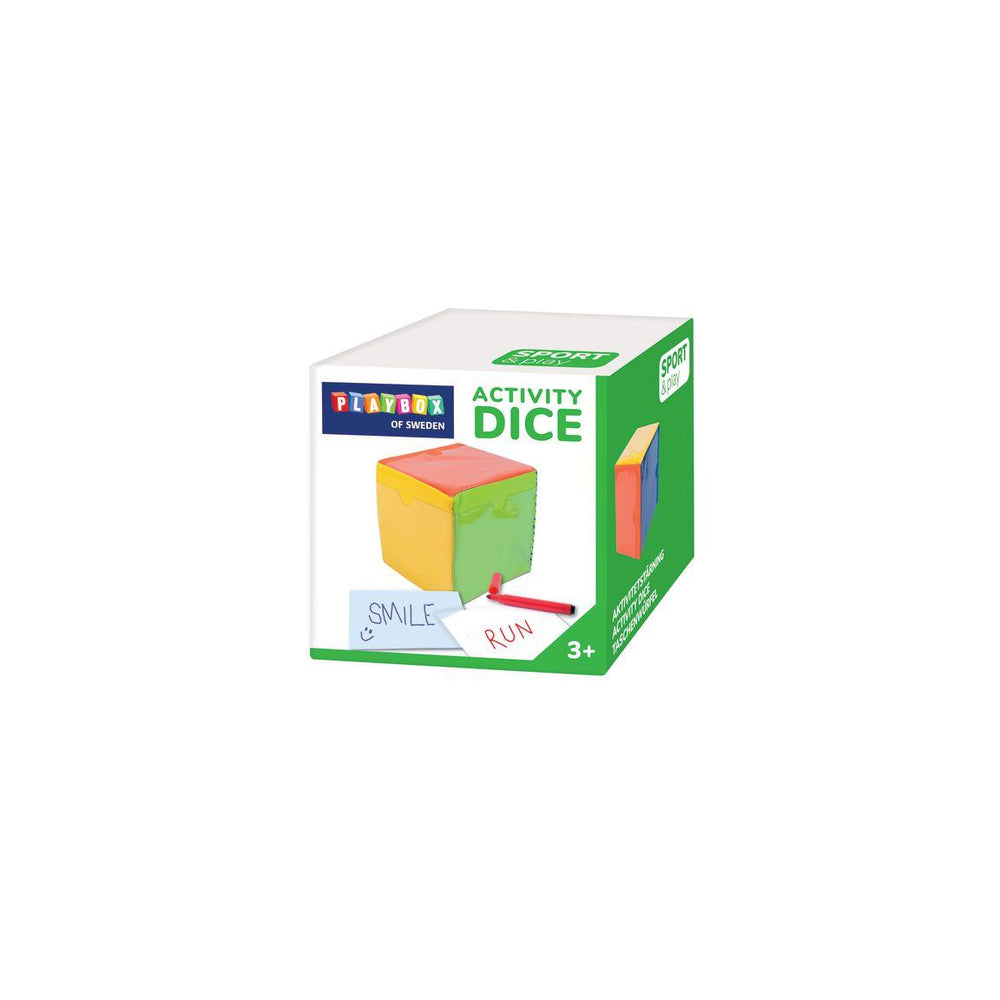 Colourful activity cube with transparent pockets on the side. The activity cube offers endless possibilities for creating educational tasks and games for children. Write notes with different activities and put them in the pockets, for example, jump like a frog or slither like a snake. The dice are made of foam so they don't make noise when they roll on the floor. - Dimensions: 15x15x15cm, - Colours: green, orange, purple, red, yellow, and blue - Material PU and EVA - PVC-free