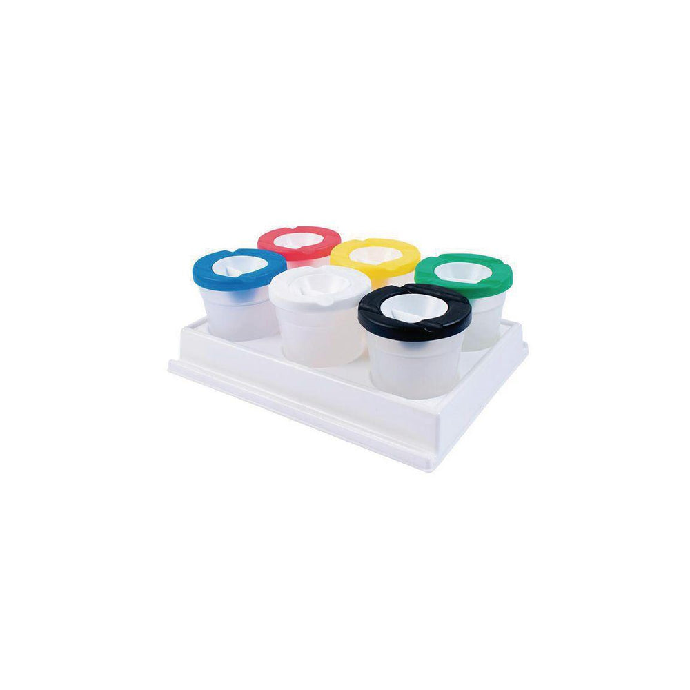 Practical brush mug for creative occasions. Smaller brush mugs that stand firmly in their stand. The smart and colourful lid allows you to easily separate your colours. Pack of 1 tray and 6 mugs. - Qty: 6 brush cups and 1 plastic tray - Dimensions brush cups Ø 78 mm, height 88 mm - Dimensions plastic tray (WxLXH): 25.5x19.5x3.5 cm - Material: PP and PE plastic