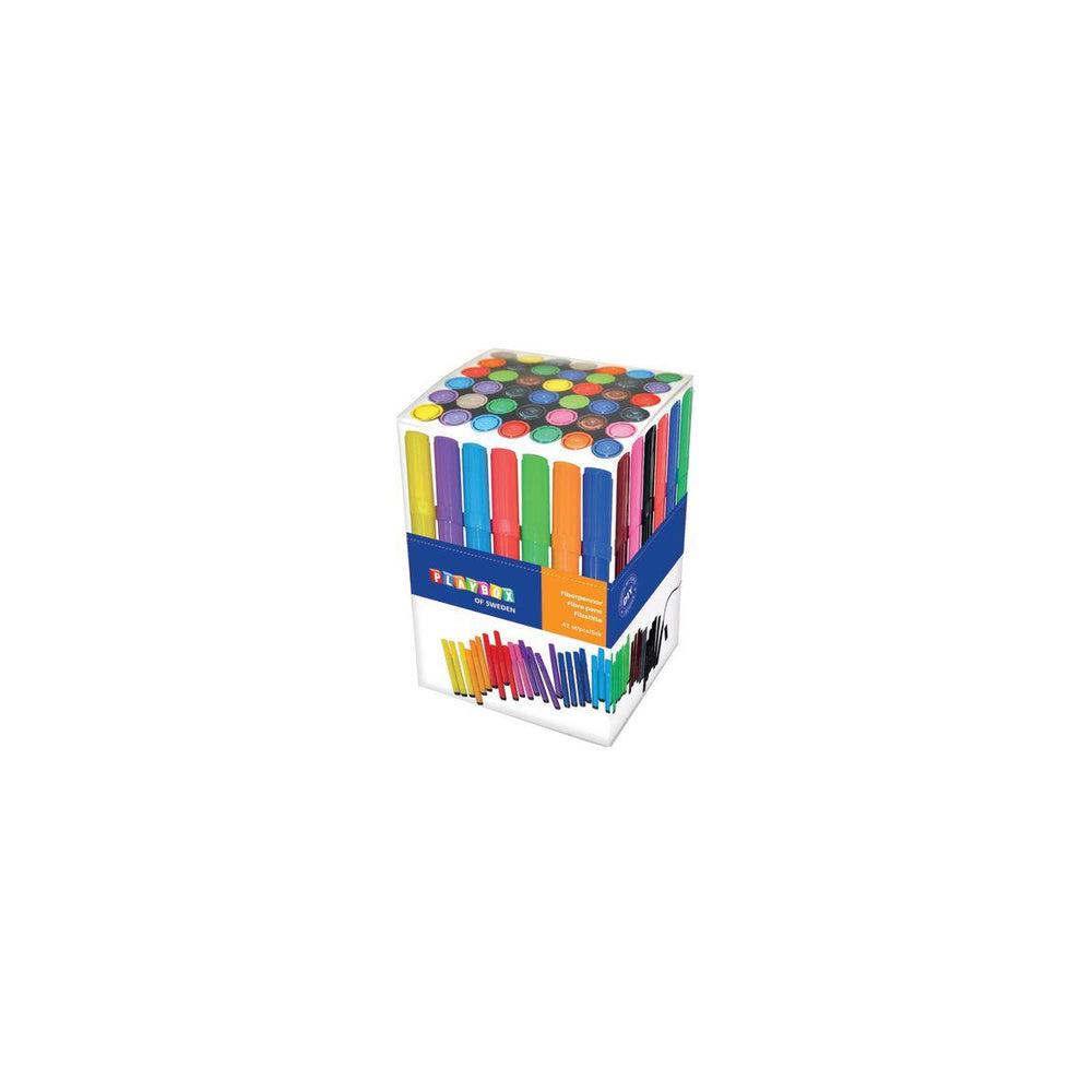 Set of thick fibre-tip pens in twelve lovely colours, collected in a practical box. The pen can handle tougher jobs without, for example, the tip being pressed in under heavy loads. The cap is ventilated to avoid choking. Can be washed off most surfaces - Made of: Polypropylene (PP) - PVC-free - Round tip - Pen body colour: Same as text colour - Pen body dimensions: - Length: 12.5 cm, Ø 1.5 cm - Tip width 6mm - Line width 1.7mm - Can be washed off most surfaces - Quantity: 42/pk (12 different colours)