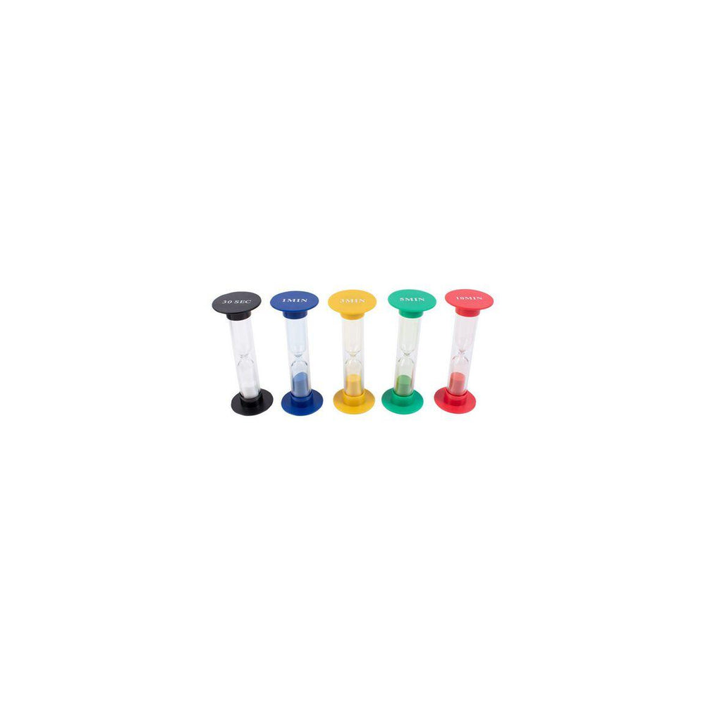 How many somersaults can you do in 30 seconds? How long is a minute? Explore and learn more about time with hourglasses. Use the hourglasses to time tasks or response time in games. The five hourglasses measure 30 seconds, 1 minute, 3 minutes, 5 minutes and 10 minutes. - Material: ABS, PC, glass, coloured sand - Height: 14.5 cm - Recommended age: 3+ - Accuracy: ±10%