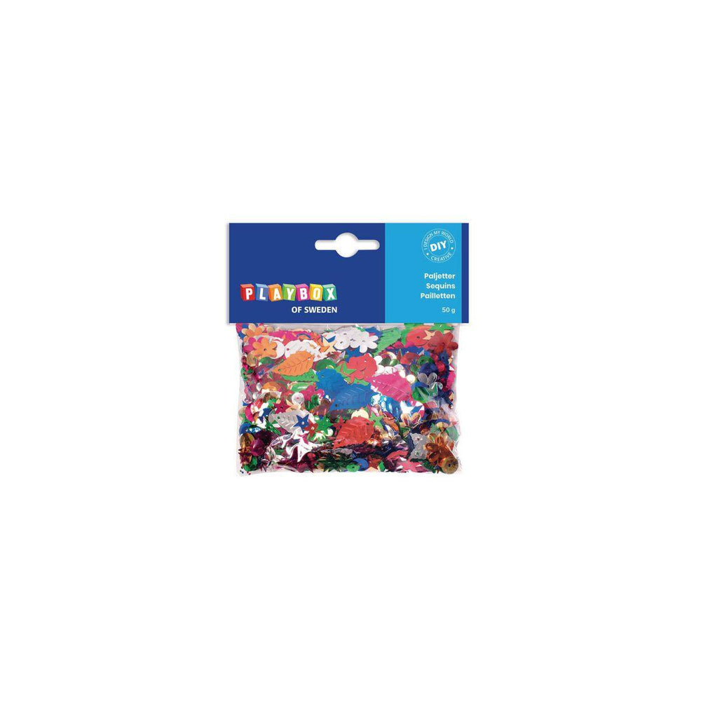Sequins with many different motifs and in a wide range of colours. Use the sequins for crafts or decoration - stick or sew on postcards, packages, drawings, fabric or decorate tables at festivities - Dimensions: Ø 6-24 mm - Colour: Gold, silver, red, cerise, blue, green, orange and pink - Material: PET