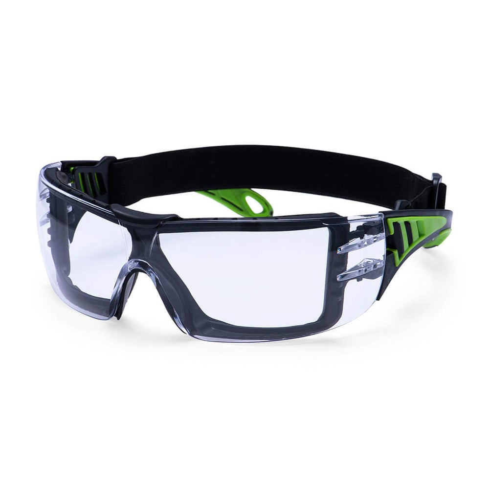 Dielectric safety spectacles with metal-free hinges feature a tough and modern design with dual material on the side arms.