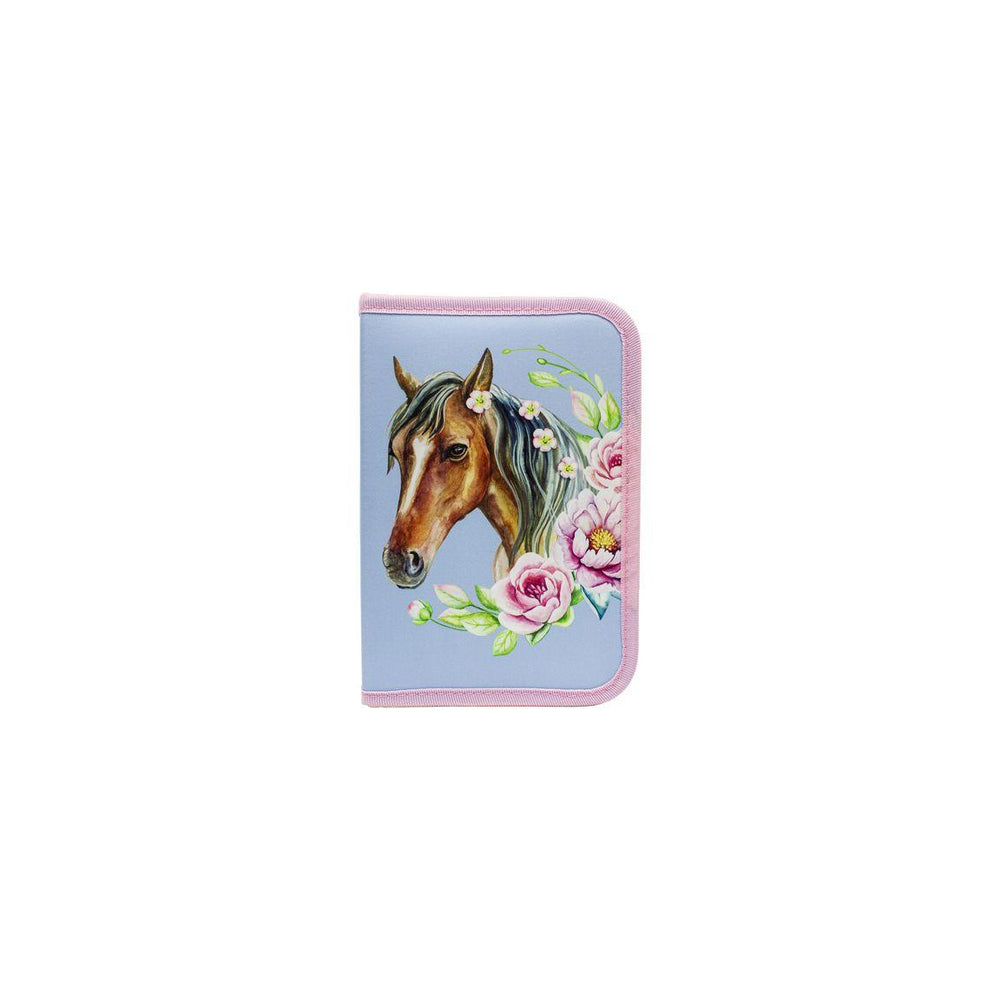 A filled pencil case containing 19 pieces with a horse motif. The set contains 10 wooden coloured pencils, 2 pencils, 2 gel pens, 2 highlighters, 2 ink pens, 1 pencil sharpener and an eraser - Warning. Not suitable for children under 3 years old