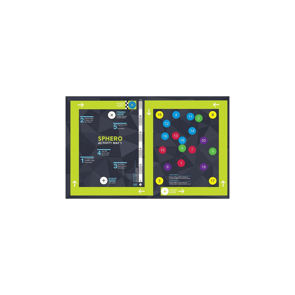 The mat can be used while using Draw, Block or Text projects in the Sphero Edu app. Racetrack Challenge: Students can work together to programme the Sphero SPRK+ around the track on the outside of the mat. Two teams of students can race against each other to complete the reversible track. Students between the ages of 7 and 16 can use the block or text projects to create their own code to run the SPRK+. They must take into account headings, angles, speed, distance and time while programming the SPRK+ around the track. Circles Challenge 1: Students answer maths questions by programming SPRK+ to move to one of the numbers. The teacher can ask '5 + 6' or 'square root of 81' and students of any age can use a character print, block or text project to programme SPRK+ to the correct number. Circles Challenge 2: The coloured circles form one 2D shape per colour. The square between each coloured circle is one side of a 2D shape. Yellow = Square. Red = Rectangle. Blue = Hexagon. Green = Irregular triangle Purple = Triangle Students can use a character print, block or text project to use code to explore the properties of the 2D shapes. Gates Challenge: A truly interactive challenge that develops problem-solving skills, co-operation between students, computational thinking and knowledge of angles, shape and space. Beginning at 'START HERE' and ending at 'FINISH HERE' students must use a block or text project and follow the instructions at each gate. Students will be able to extend their mathematical knowledge while exploring sound, movement and light with SPRK+. - 2 groups of 2 students should use the mat at each session, each with SPRK+ - Check out edu.sphero.com for a lesson plan for use with Sphero Activity Mat 1 - Dimensions: 2010x1220mm