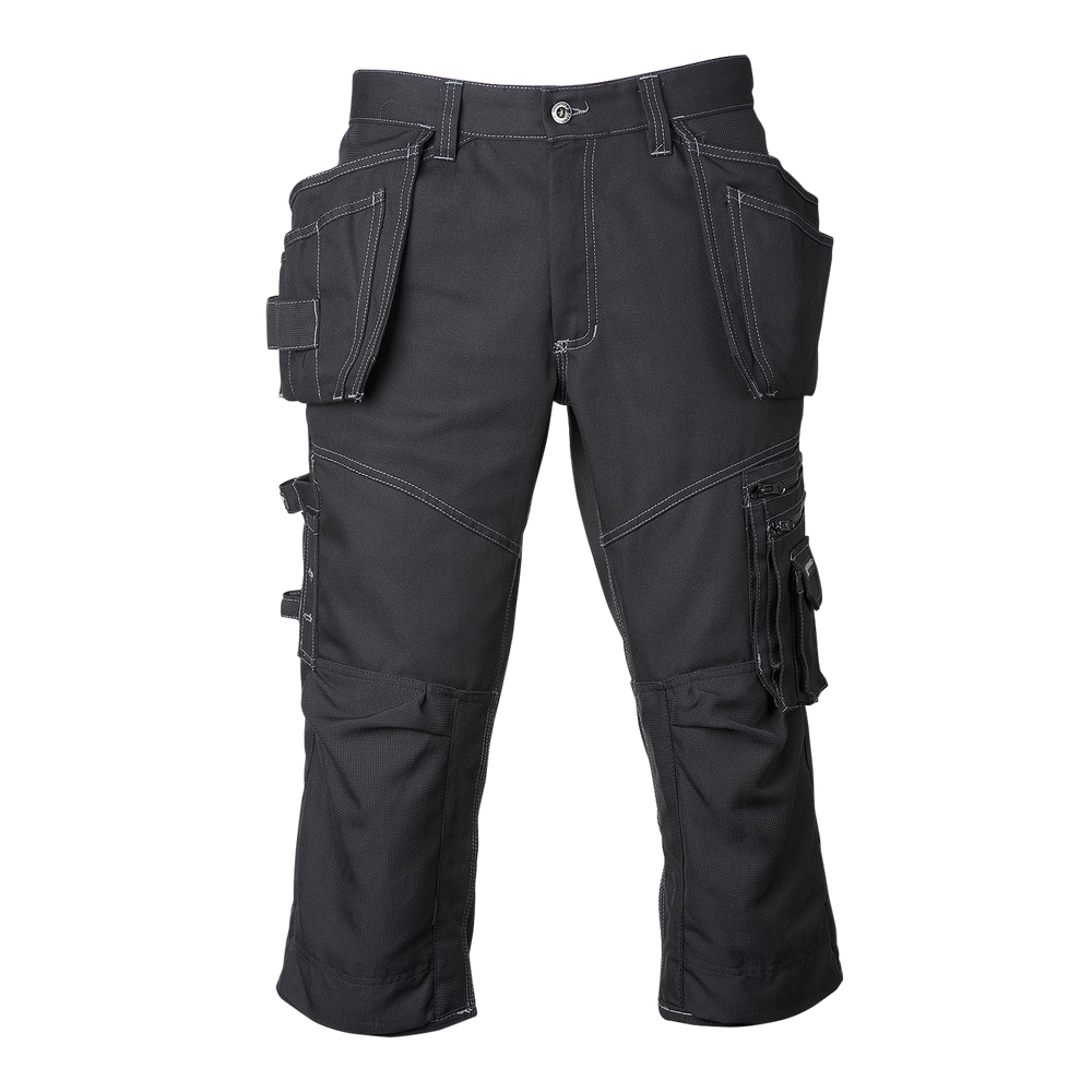 Two reinforced hanging pockets. Left with extra pocket. Right with three smaller pockets and loops f or tools. Two large front pockets. Rule pocket with room for two knives. Leg pocket with zips. Two reinforced hanging pockets. Left with extra pocket. Right with three smaller pockets and loops f or tools. Two large front pockets. Rule pocket with room for two knives. Leg pocket with zips. Phone  pocket. ID pocket. Hammer hanger x 2. Two reinforced back pockets. S-structure knee pockets. Knee p rotection can be positioned at two levels. Articulated legs.