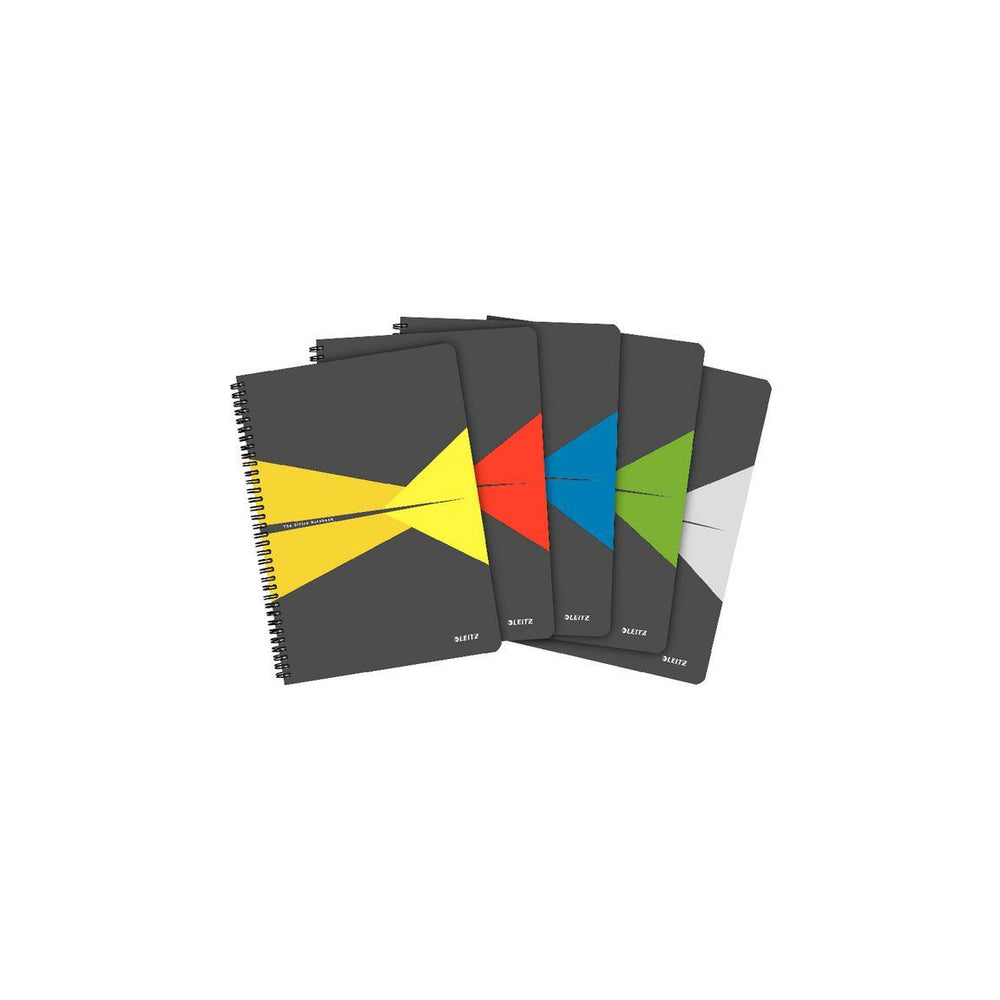 Leitz Office A4 spiral notebook with 90 lined pages with good opacity The ultimate notebook for daily notes. The pad has 90 sheets of high quality 90 g/m2 paper, laminated cardboard cover pages and is spiral bound for 360 degree opening - Lightweight yet durable flexible laminated cardboard cover pages - Spiral binding allows the pad to open 360 degrees, fold it in half and use it as a writing pad to take notes - High opacity paper with a special finish creates a better writing surface without smudges - Framed ruled with title and date line at the top for better organisation of notes - Detachable ruler that can also be used as a bookmark - 90 sheets of A4 FSC® certified 90 g/m2 paper - Colours: Grey, Yellow. Green, Red and Blue