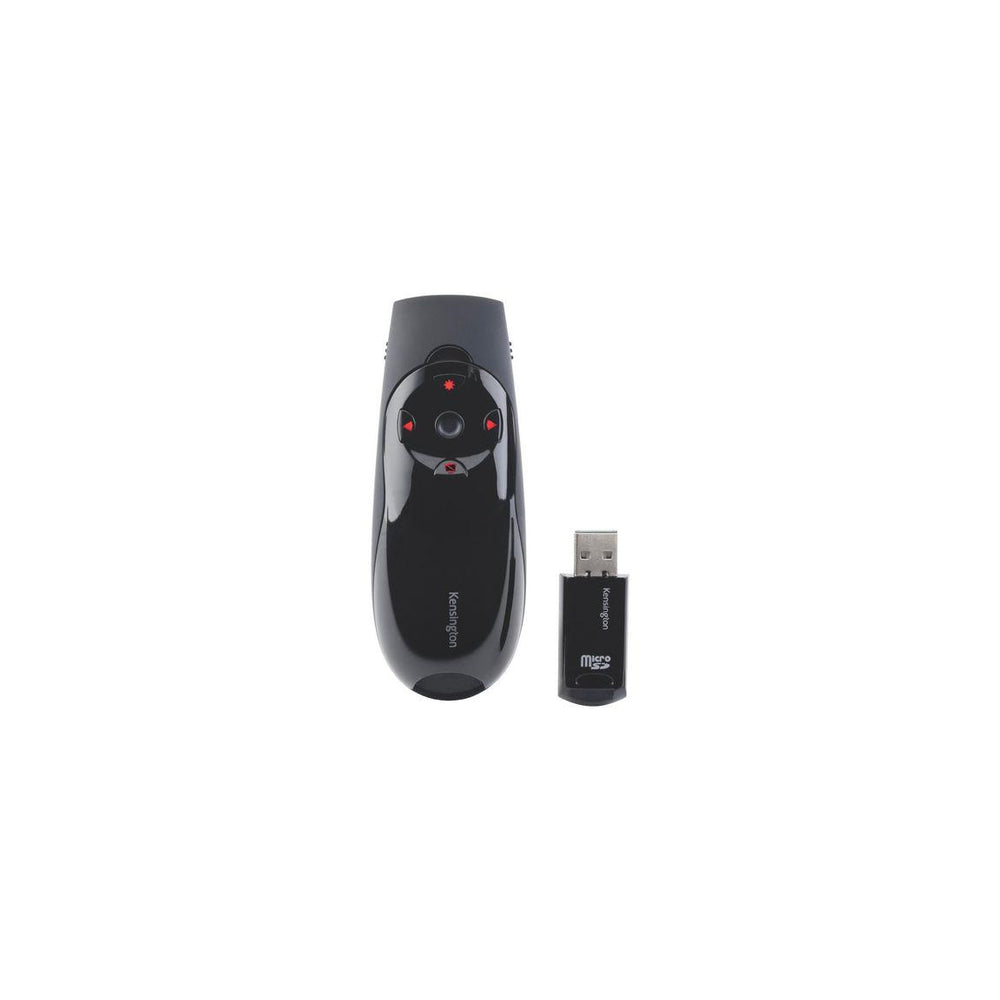 Denna Kensington Presenter ExpertTM tar kontrollen av presentationer till en ny nivå. Den har en intuitiv fyrvägs joystick som presentatören kan använda som en mus med styrning upp/ned och vänster/höger. Bakgrundupplysta kontroller och en ergonomisk design bidrar med både bekvämlighet och komfort. Den trådlösa 2,4 GHz mottagaren förvaras inuti själva presentatören när den inte används. Produkten är CE-märkt. - Markörstyrning med en joystick låter dig använda presentatören som en mus och du kan flytta markören upp/ned och vänster/höger. - Knappkontroller med bakgrundsljus flyttar sidor framåt/bakåt, släcker skärmen och aktiverar den röda laserpekaren - Utökad 45 meter trådlös räckvidd för att nå hela rummet - Trådlös USB-mottagare förvaras i själva presentatören så att den inte försvinner - Med trådlös plug-and-play-anslutning kommer du igång snabbt och enkelt - Bekvämt grepp med speciella handkonturer - CE-märkt