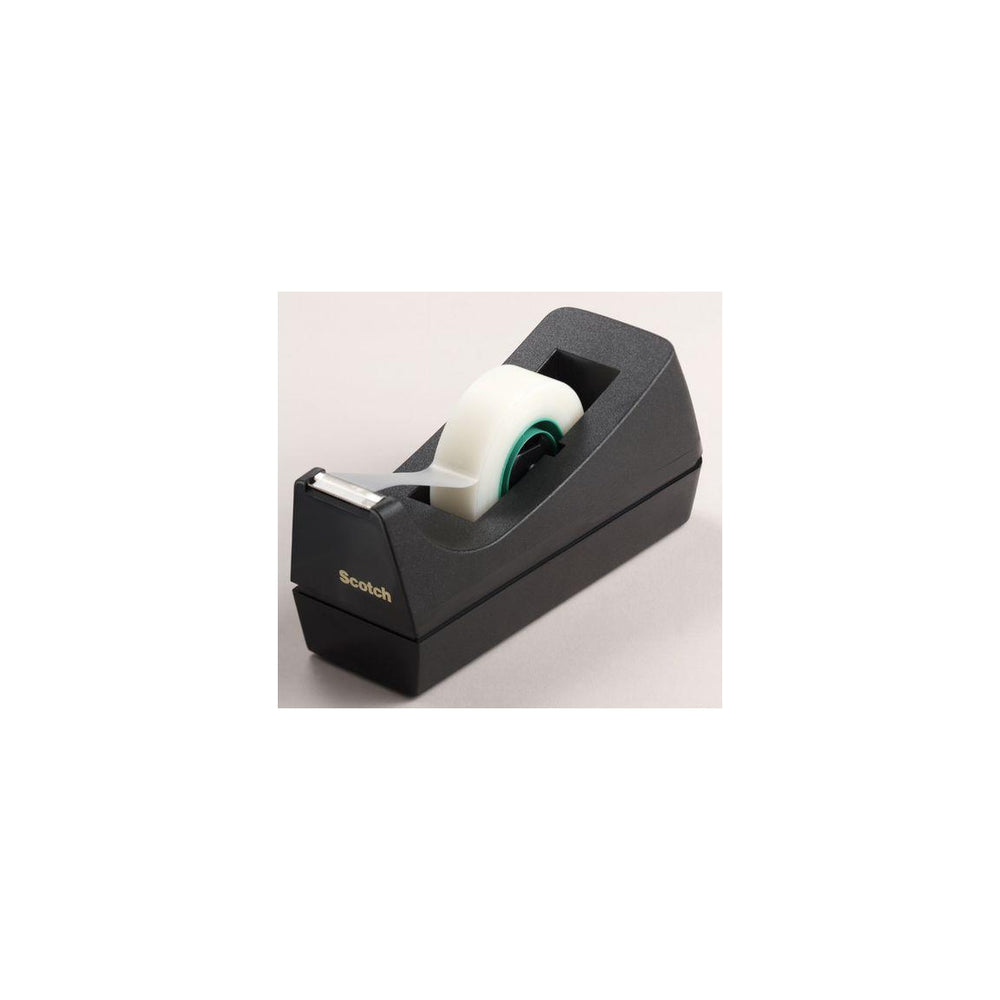 Scotch® tejphållaren har en gummerad, halkfri och vattenbeständig bas och står stadigt på alla slags bord, så att du enkelt kan få tejp vid behov. Metallkniven gör att du enkelt kan skära loss Scotch®-tejp. Den här kompakta tejphållaren är utformad för att användas med en hand och är lätt att byta rullar i. Den är enkel att använda och lämplig för tejper med en bredd på upp till 19 mm. - Utformad för användning med en hand - Har halkfria gummiskydd vid basen - Har metallkniv - Tillverkad av 100% återvunnen plast - Dispenserns material: Plast - Maximal tejpbredd: 19 mm - Maximal tejplängd: 33 m - Färg: Svart
