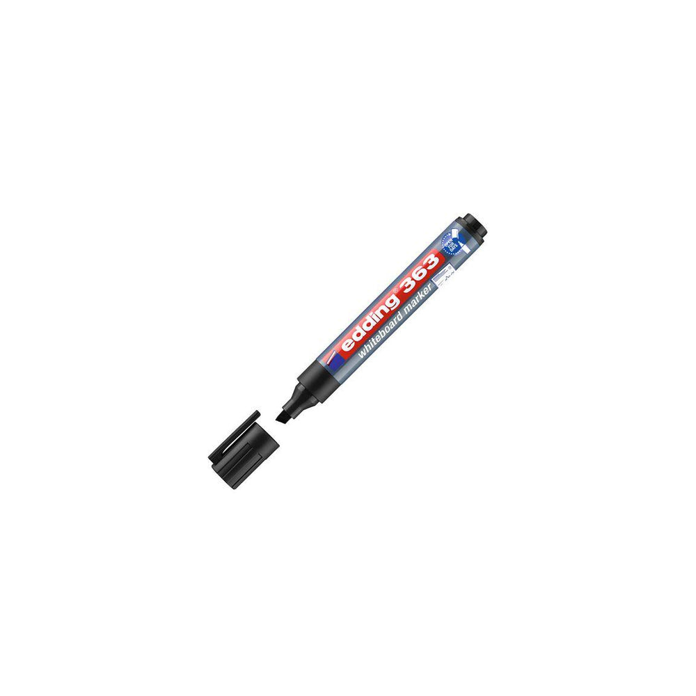 Whiteboardmärkpennan Edding 363 innehåller ett luktfritt pigmentbläck och kan användas på alla whiteboardtavlor och andra icke-porösa ytor. Den här märkpennan är speciellt utformad för användning på whiteboardtavlor och nästan alla icke-porösa ytor, till exempel emalj, glas och melamin. Det snabbtorkande och ljusbeständiga bläcket kan enkelt torkas bort. Märkpennan innehåller ett torksäkert bläck som - Icke permanent bläck - Med huv - Snedskuren spets - Linjebredd: 1 - 5 mm - Textfärg: Svart - Färg pennkropp: Svart/Grå